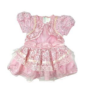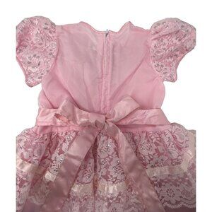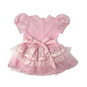 • Pink Lace with Silver Design Ribbon, & Pearls, and Zips Down Back.  Mesh Netting Under Lacy Skirt with Pink & Silver Design, Silky Underskirt (no fabric content tag, but assuming polyester since the other two underskirts feel the same and are polyester.}  Also no Size tag but it measure the same as the other 2.