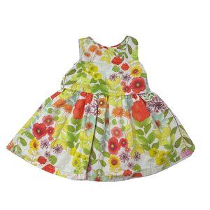 • White Dress with Floral Design in Orange, Yellow, Green, with a little Burgundy, Pink, & Light Turquoise, Silky Underskirt, 2 Snaps on Shoulder, Dress - 100% Cotton, Underskirt 100% Polyester