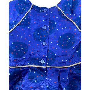 • Purple Dress with Large Circles in Dark Purple, Gold Trim and Small Dots in white, Light & Dark Pink,  4 Buttons Down Back Silky & Mesh Underskirts - 100% Polyester