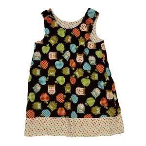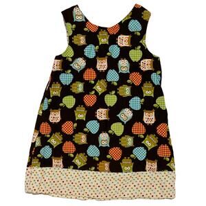 Corduroy jumper dress. No size or brand tag but fits like size 5T. Fall owl and apple print with polka dots on hem. Cute school dress in autumn brown, orange, beige, orange, green and blue colors. Excellent preowned condition EUC, no flaws. Professional, highly rated seller, quick shipper, open to offers!