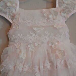 Varied pink tulle dress in a size 2T with flowers on it. In good condition. Puffy sleeves, tie in back. Brand Biscotti