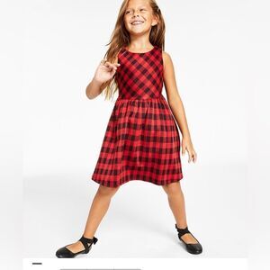 Set featuring a lurex knit coat with buffalo check trim dress and bow detailing.
