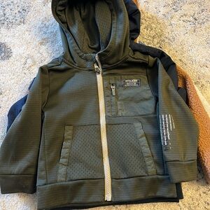 Explore this stylish collection featuring a denim jacket, a brown fleece jacket, an olive green jacket, and a navy raincoat. Brands are fresh impressions, north face, athletic works and children’s place. Mix sizes 24month and 2T. Perfect for versatile styling.