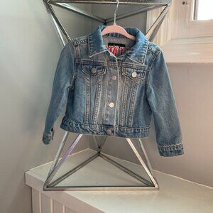 Barley worn toddler jean jacket from Quince that I personalized by adding a large sequin heart and embroidered "Mini" on the back. Hate to get rid of this because it's so cute and great quality but no longer have a need for it!