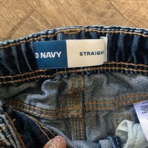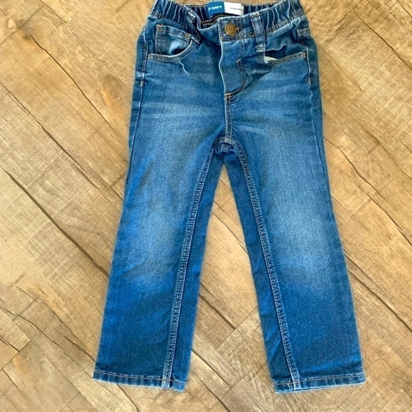 Toddler Old Navy Straight Blue Jeans with Elastic Waist. Dual front and rear pockets, belt loops, elastic/stretchy waist band, zipper with single snap button clasp.