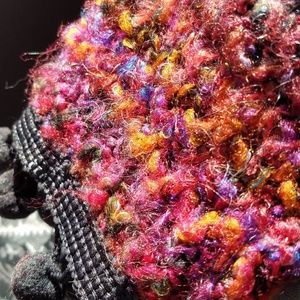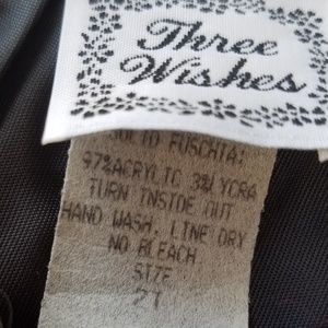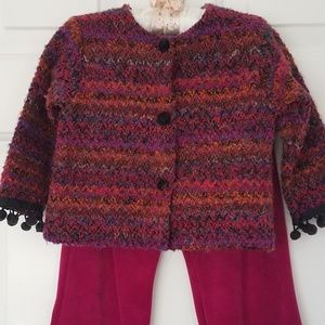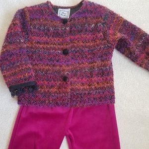 Fully lined boucle jacket with three snap closures, faux velvet buttons on the front. Little pom-poms trim the ends of the sleeve and pants.