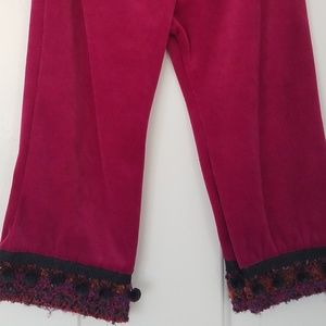 Comfortable fuschia velour pull-on pants with elastic waist and matching trim to the jacket.