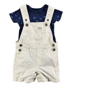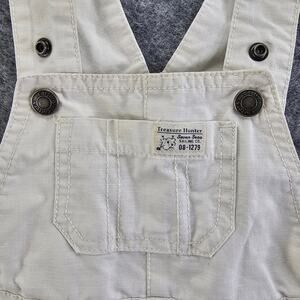 Carter's overalls size 12 months are off-white 100% cotton ripstop bib style shorts with a little patch Sewn on the front bib that says "Treasure Hunter Seven Seas Sailing Co". Adjustable suspender straps and snap bottom for easy changes, in good preowned condition. (Paired with a Just One You by Carter's 12 mo one-piece bodysuit.)