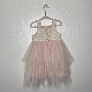 Gorgeous Pink Tulle Ruffle Sleeveless Dress. Features three tiers of pink sheer tulle, fully lined, embroidered pink and silver floral print on bodice, three buttons up back. In excellent condition. Perfect for a birthday, special occasion, princess dress up! Size 2T