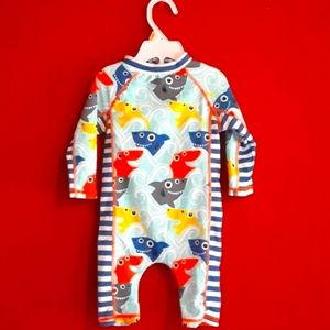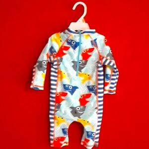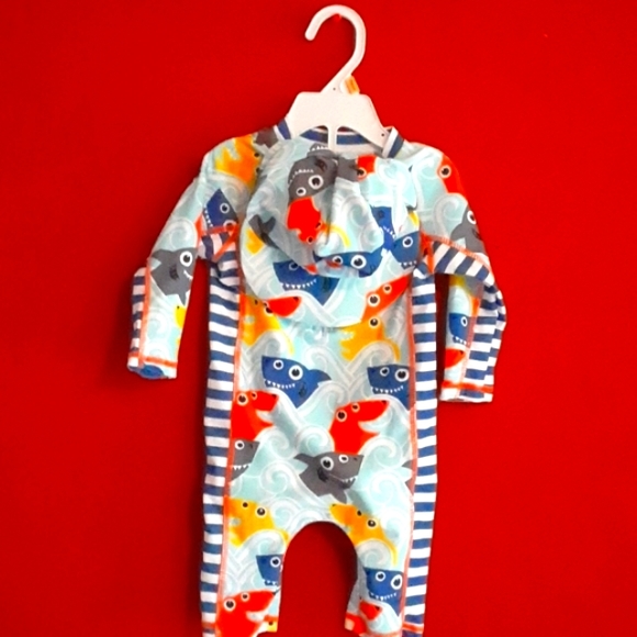 Rashguard with matching sun visor hat. Multicolor shark in ocean print. Blue and white striped side panels with orange contrast stitching.