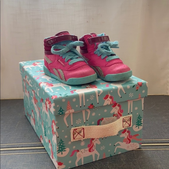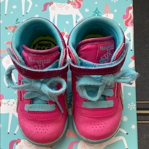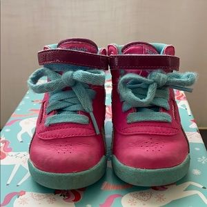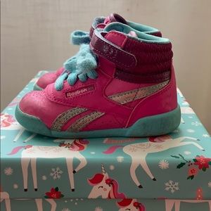 Pink and blue with sparkly silver stripes. EUC. Size 5.5