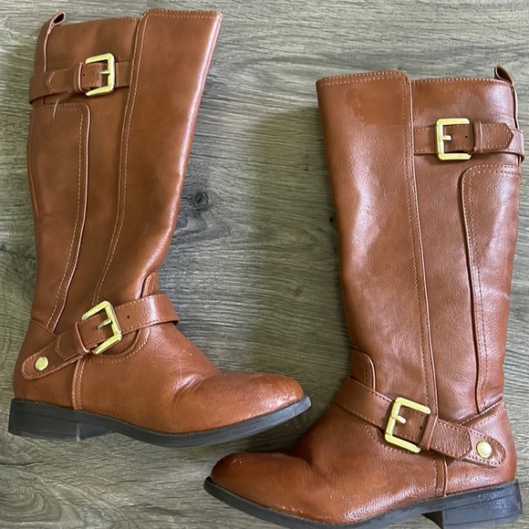 These boots are precious! They have a fully functioning zipper on the inner side. Gold buckle details. See pics for light scuffing, albeit being barely worn. GUC (Great Used Condition)