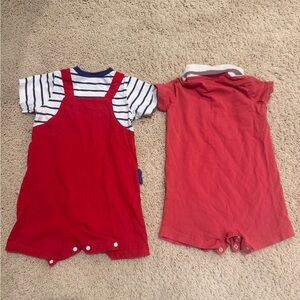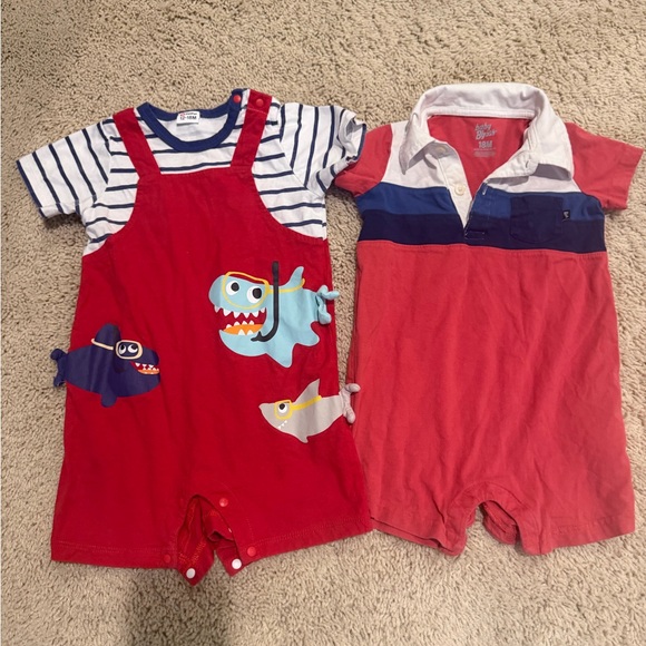 Adorable red romper with playful shark design. Second piece is a red and blue collared romper.