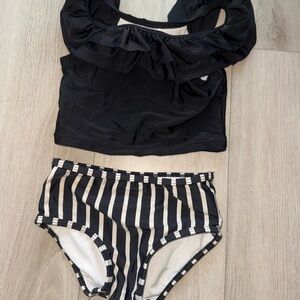 Chic black bikini top with ruffle accents. Matching black and white striped bottoms. Ideal for poolside fun.