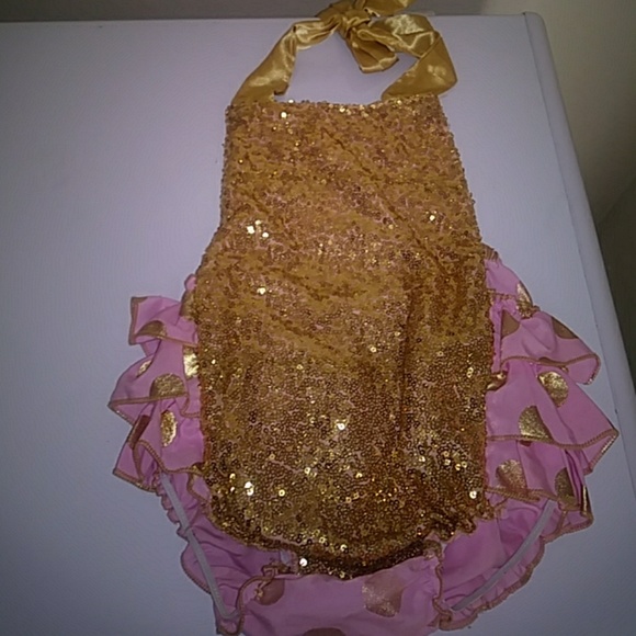 Beautiful pink color with gold polka dots and sequins. Ties around neck. Like new.