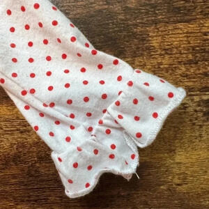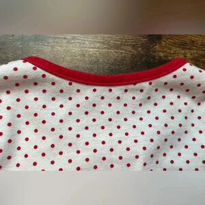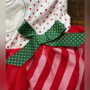 Toddler Santa dress. Size: 4. Bodice is white with red polka dots, crew neck with Santa face embroidered on the front. Long sleeves with ruffle at cuff. The skirt is red & white stripes with red tulle, and a green and white polka dot accent bow. Length: 17”. PIT2PIT: 11”. 60% cotton, 40% polyester. Good, used condition.