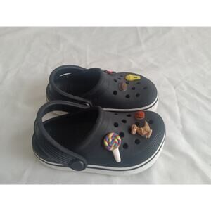 Adorable pair of authentic toddler-size 8 Crocs in black with a white outsole and a playful set of Jibbitz charms. These clogs feature a mix of fun themes including a colorful lollipop, dinosaur, football, basketball, popcorn, and a red train – perfect for little ones who love to explore in style! Slip-on design with heel strap for secure fit. Great for everyday wear, daycare, or playtime. Gently pre-owned and clean. Ready for a new adventure!