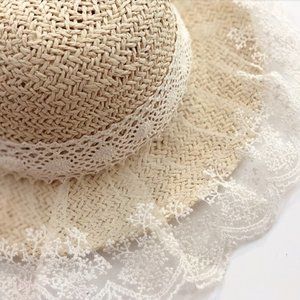 Our oatmeal straw hat has a gorgeous embroidered lace overlay, ivory ribbon and a chin strap! Perfect for Spring and Summer Days and Easter too!