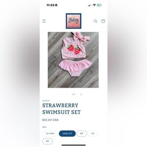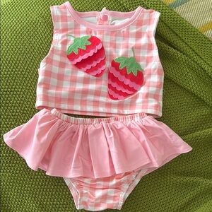 Mud Pie| Adorable pink swim set with a playful strawberry design, featuring ruffle detailing. Perfect for fun days at the pool or beach. NWOT. 82% Polyester and 18% Spandex.