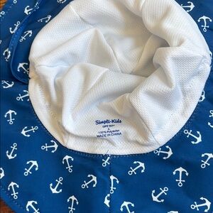 Embrace sunny days with this stylish blue and white hat from Simpli-kids, featuring a nautical anchor pattern. Designed with a wide brim for optimal sun protection and a secure chin strap, this lightweight accessory is perfect for beach outings. Size Large. Never worn. New with tags. Smoke free home.