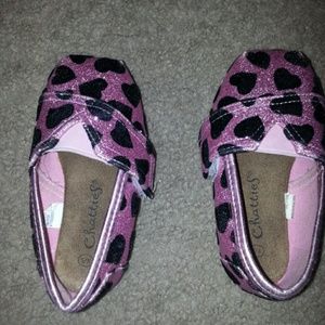 Pink glittet shoes with black heart. Velcro strap across shoe