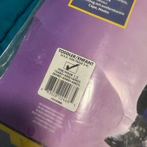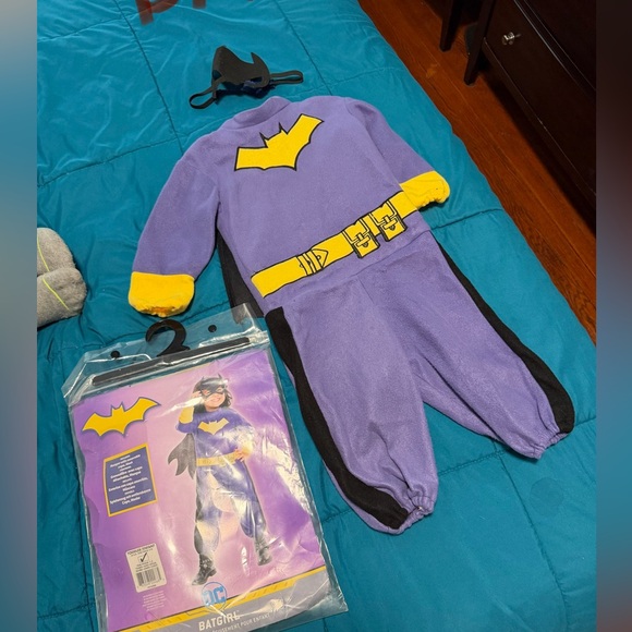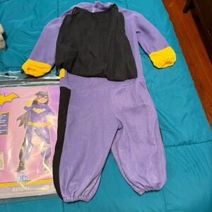 Toddler batgirl costume. The size on the package says USA size 2-4 for 1-2 years. Comes as shown in the photos. The mask had some extra string sewn onto it as shown. Small hole shown and one was patched up as shown. I may have missed something minor. Ask any and all questions. No returns.