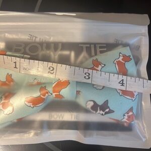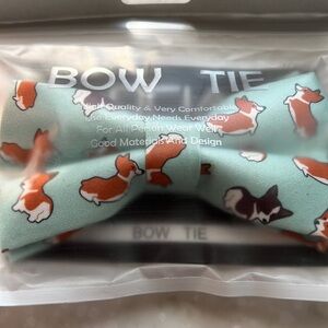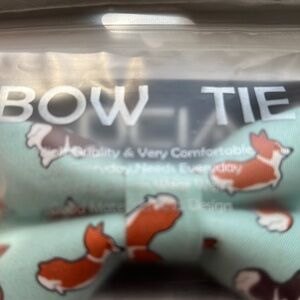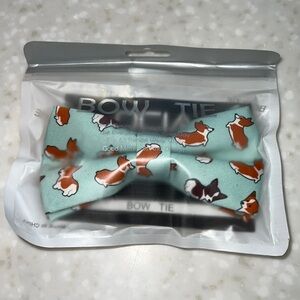 Super cute new in package bowtie please view pictures it’s kind of hard for me to tell the colors I think either green or blue with little dogs that are dark brown light brown and white