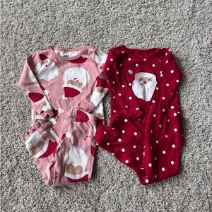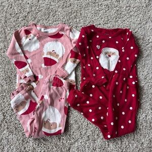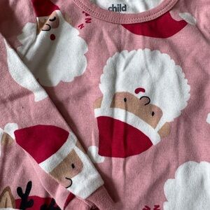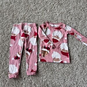 Festive 2-pack of holiday pajamas in size 2T. Includes one pink set with diverse Santa faces and one red set with a big Santa face and white polka dots. Both are long-sleeve cotton PJs, perfect for cozy winter nights and holiday photo ops. Gently worn, excellent condition.