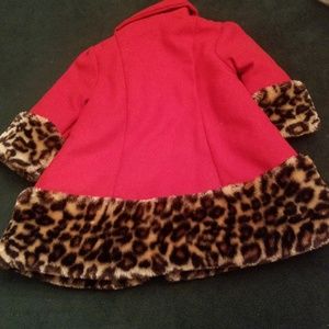 Gently worn pea coat. Size 18 months. Trimmed collar sleeves and bottom in leopard faux fur. No imperfections!