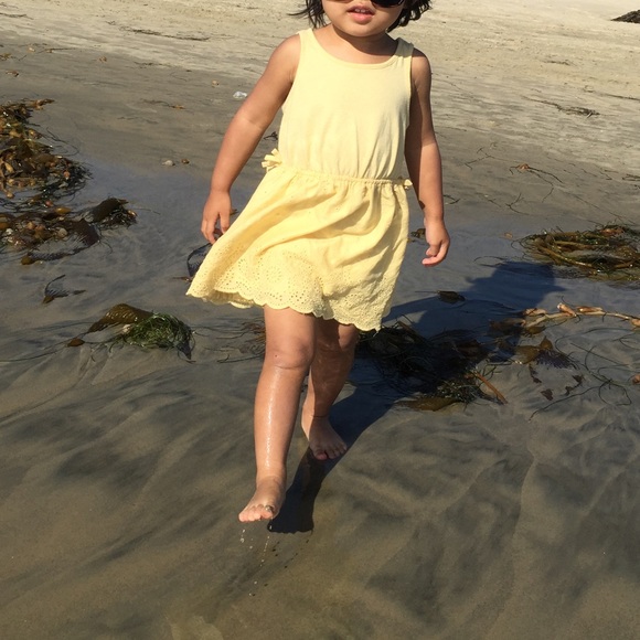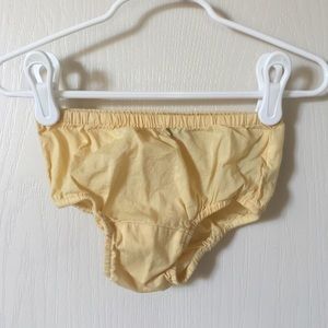 Adorable soft yellow dress with cute eyelet details at bottom. Comfy and stylish! Matching yellow undies!