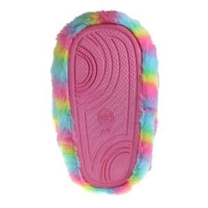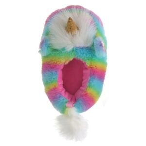 Little girls will be dreaming big in these sweet unicorn stuffing slippers. Featuring 3D ears and a unicorn horn, all over soft rainbow plush upper and baby terry lining/sock. Also has indoor/outdoor bottom she can run and play in these cozy slippers.