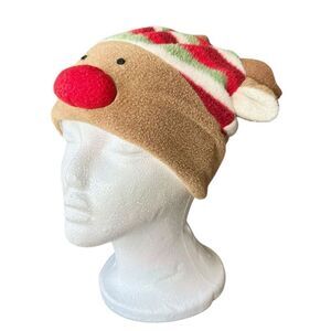 Toddler’s Fleece Raindeer beanie with horns and ears and a cute red rudolph nose. Toddler size. Measures 17” diameter. Warm soft polyester fleece. Cute.