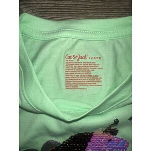 This Toddler Girls' Rainbow Unicorn Short Sleeve Shirt in size Large (10-12) is a vibrant and playful addition to any little girl's wardrobe. Made from a comfortable blend of 60% cotton and 40% recycled polyester, this shirt features a solid green color with a whimsical unicorn character design. The pullover closure and crew neck neckline make it easy to put on and take off, perfect for casual occasions during the winter, fall, or spring seasons. Lightweight and collarless, this T-shirt by Cat & Jack is a machine washable and machine polyester blend fabric, making it both stylish and practical for young children.