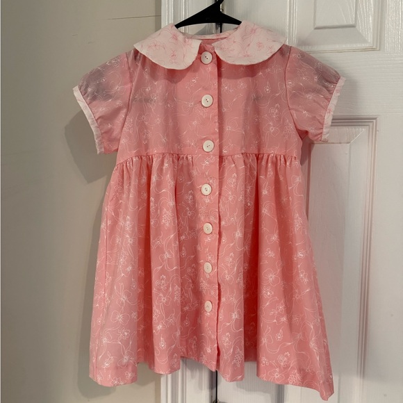 Toddlers vintage pink bow Button-Up babydoll dress hand sewn from the 1970s
