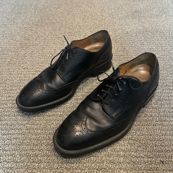 Elegant black leather Oxfords by Tod's. Features classic brogue detailing. Perfect for formal occasions.