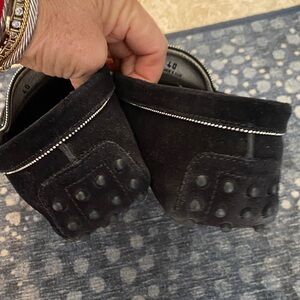 Chic black suede slip-ons with detailed stitching. Comfortable and stylish. beautiful condition suded s add s no slip soles fine crafted and metal details sz 9.5