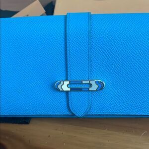 EUC- minimal wear on this beautiful turquoise blue wallet. It showcases a pebbled leather finish and a sophisticated silver-toned enameled deco clasp. It has a zippered coin pouch, 18 card slots, plenty of room for cash. Comes with box & dust cloth.