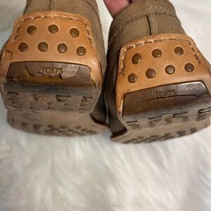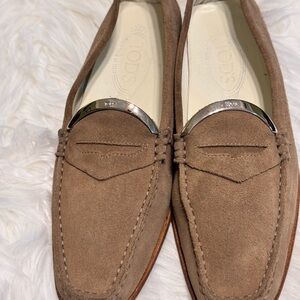 Elegant brown suede loafers by Tod's. Features a sleek silver accent. Perfect for versatile styling. Has a slight crack on the back (shown in the back). Any defects are shown in the pictures. Fairly used and in great condition! Open to offers