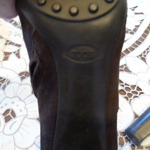 Ankle boots in rich suede with a side metal buckle, side zip on inner leg, a block heel and a para outsole. Made in Italy. Block heel height approximate 3 1/2". This shoes are almost new, very little wear. They were $1.150 at Tod's. There are no scuffs or rips. Comes from a smoke free home.