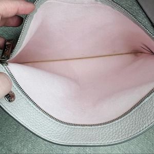 This is an extremely well made quality bag so it still can easily be worn for years to come and likely cleaned up. To me the outside of the bag is a neutral beige color and not “pink” but the inside is definitely light pink. Not sure of color name.