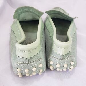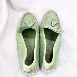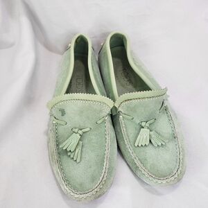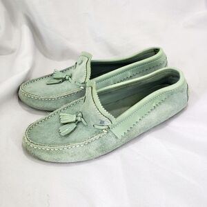 Chic light green loafers. Crafted in soft suede. Features tassel accents. Perfect for casual elegance.