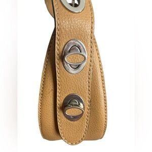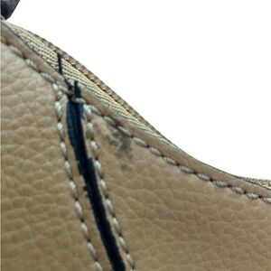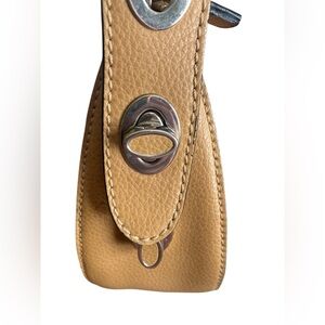 Warm brown color small tote about 10.75” at widest and about 6.5” tall without straps. Adjustable straps. Clean interior. Some tiny scuffs and one mark of wear on strap as shown in photos.