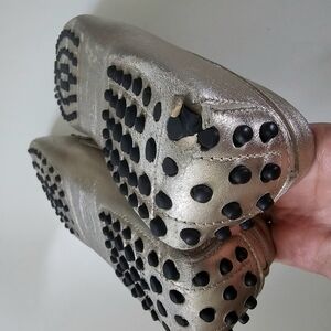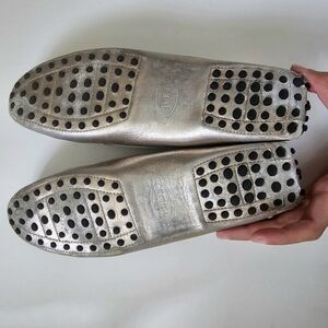 Step out in style with Tod's silver leather loafers. These elegant shoes offer both comfort and sophistication, perfect for any occasion.