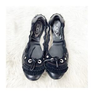 Tod's Size 9 Black Women's Leather Fringe Round Toe Ballet Driving Flat Shoes