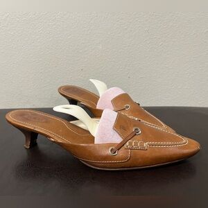 TOD’S Y2K Mule Mini Kitten Heels Whimsy Boho Cottage SZ 9, in good condition,some wear, specially on heel, some part of leather came off, does not affect wear, or is not notable while on. Leather has some water marks and scuffs. Please review pics for details.