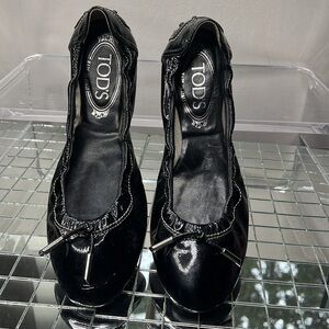 This is a beautiful pair of Tod’s Sz 6.5 Dee Patent Leather Ballet Flats Shoes. Worn once. Patent-leather. Bow-detailed. Round toe. Slip on. Pebbled non slip sole