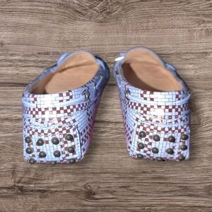 Women’s blue driving loafers from luxury Italian shoes and accessories label, Tod’s. Crafted with hammered grainy leather uppers, the slip-ons comprise a rounded apron toe with exposed hand-stitched detail, and a decorative woven tie feature with metal eyelets. Set on a signature rubber-dotted 'gommino' outsole, the loafers are finished with tonal stitching, gold-tone accents, and a Tod's logo discreetly hot-stamped to the upper.