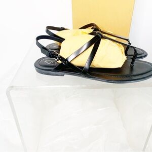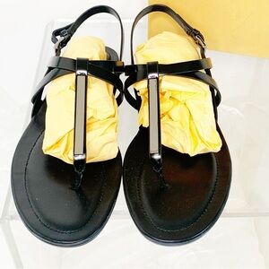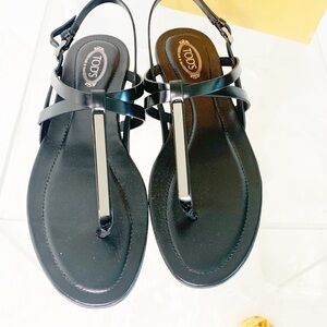 Tod’s Women’s Italian Black Patent Leather Silver Bar Accent Buckle Sandals!