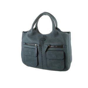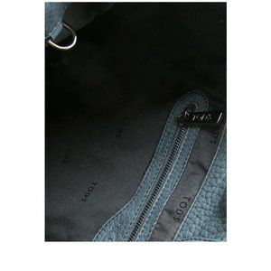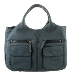 Roomy blue pebbled leather Tod's bag with gunmetal hardware. There are four pockets at front face; two with snap closures and two with zip closure, contrast stitching, black woven lining, three pockets at interior walls; one with zip closure and snap closure at top.