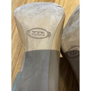 Tod's tan/Beige Leather Suede Peep Toe Dosary Pumps Size 7 studs bow front Italy